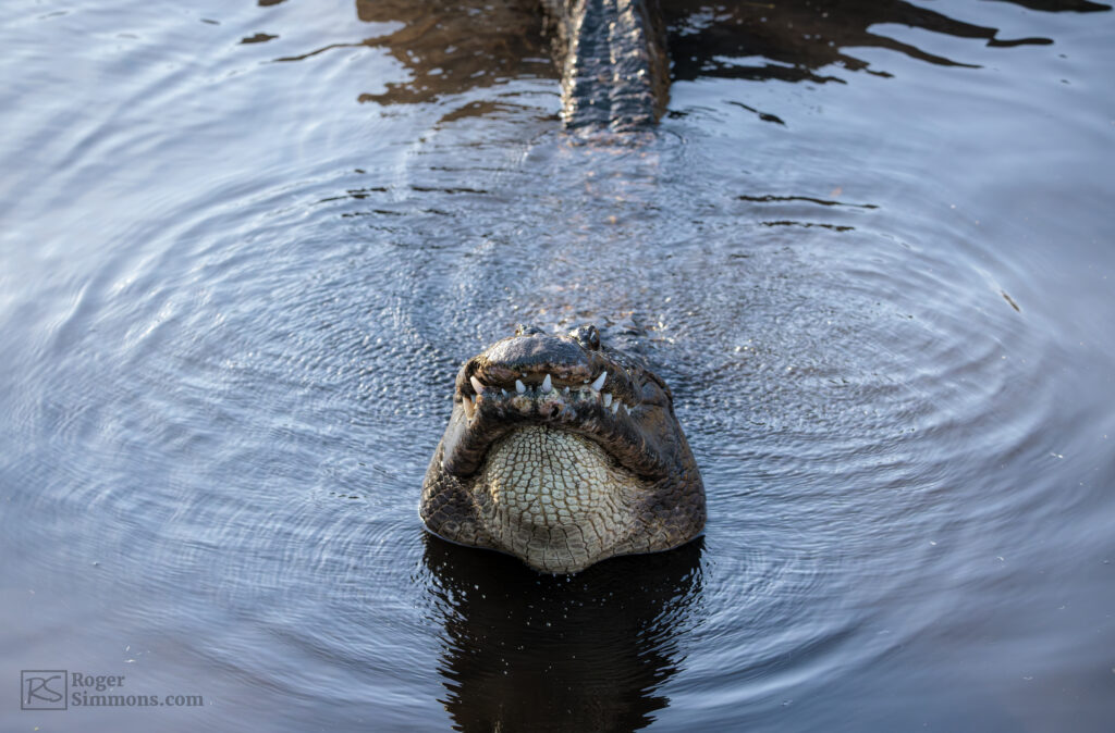Bellowing American Alligators creates vibration ripples in the water, St. Augustine Alligator Farm, January 2026.