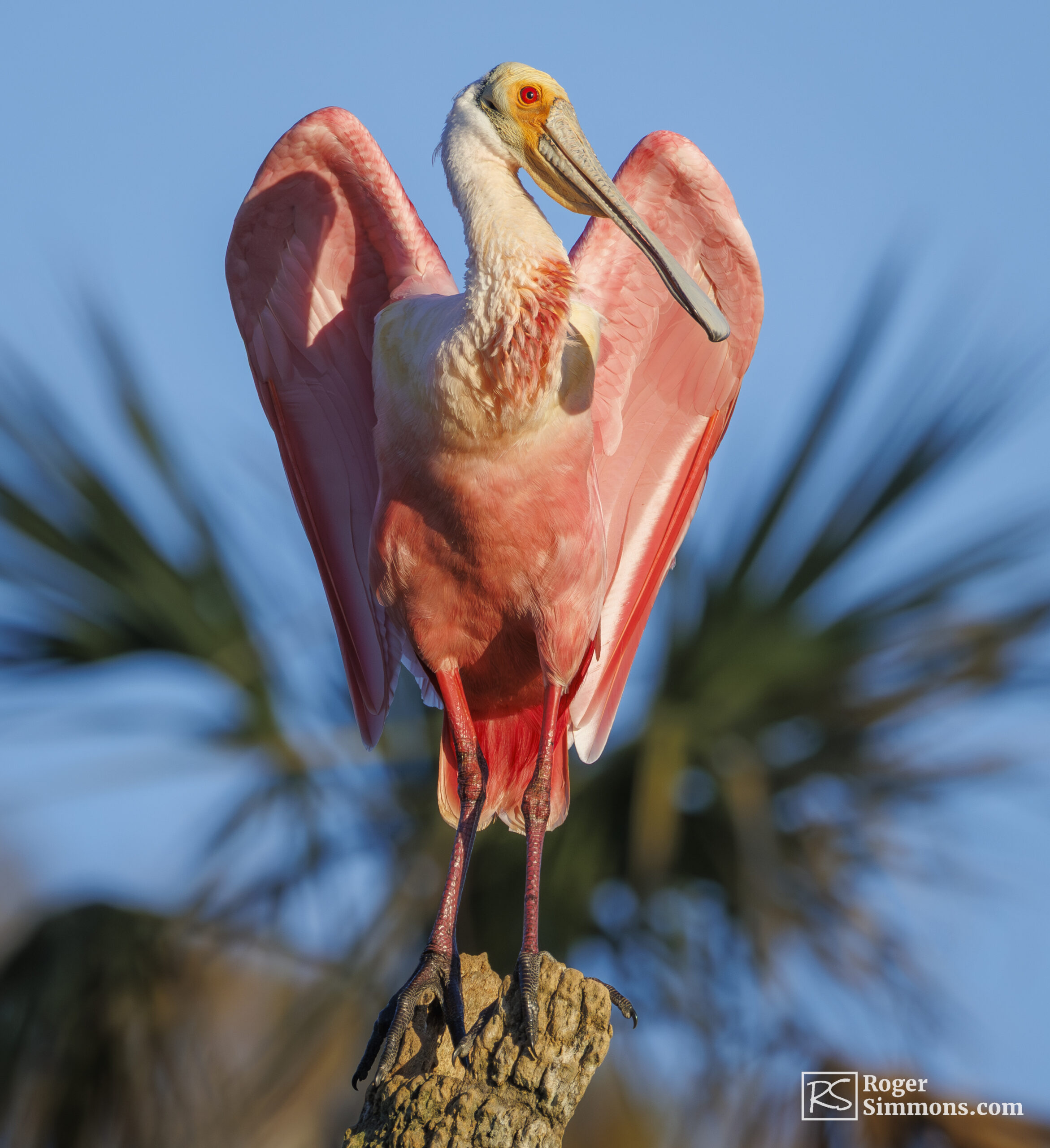 These pink prehistoric-looking birds appear so elegant when resting or perching but are downright ungainly when taking off, flying or landing.