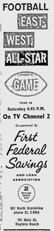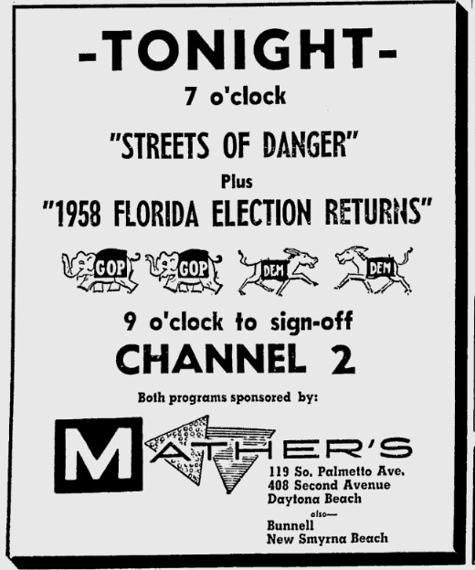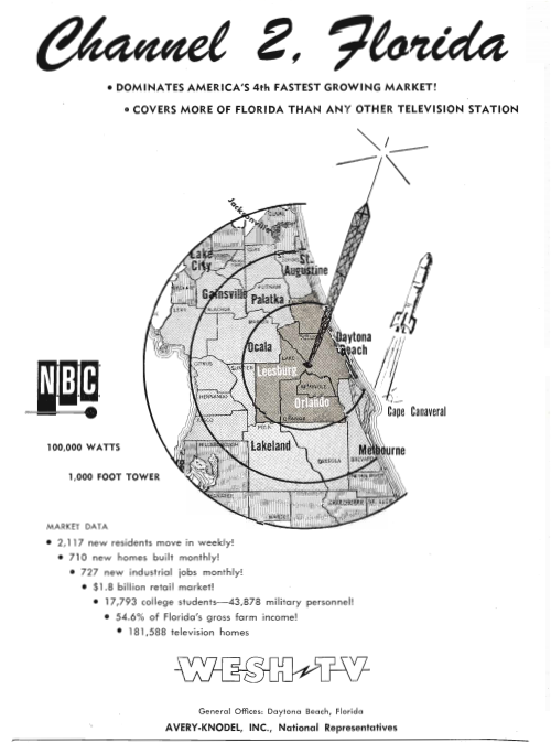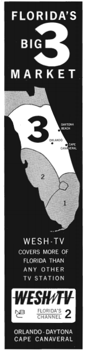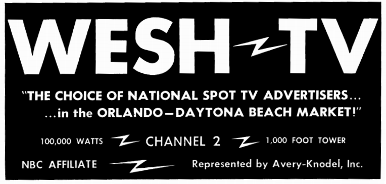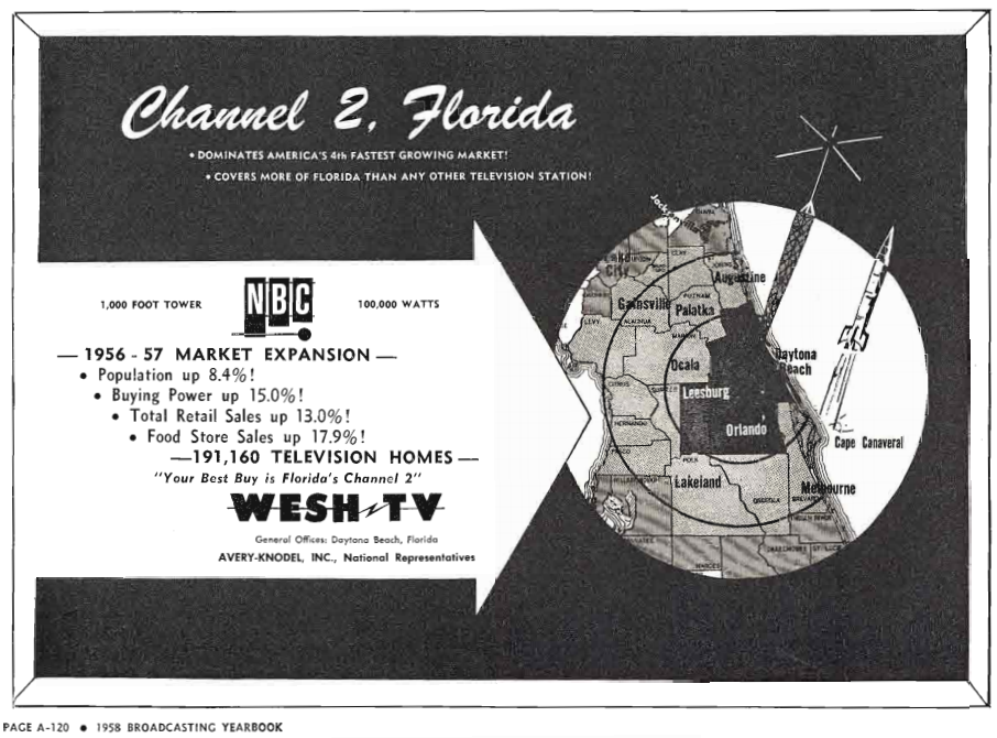 But … interesting how events might have been different. In the 1955 issue of the Broadcasting Yearbook, an ad was placed announcing the upcoming debut of “WMFJ-Channel 2” — the planned sister station of Daytona Beach ABC radio affiliate WMFJ-AM. If not for a last-minute change in ownership, there might not have been a WESH-TV, and Orlando’s ABC affiliate might be on a different channel.